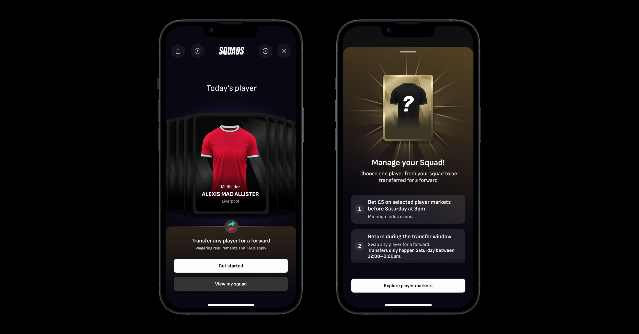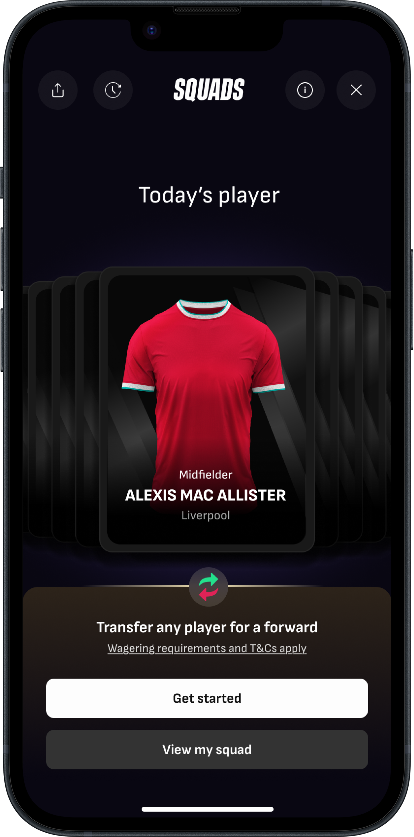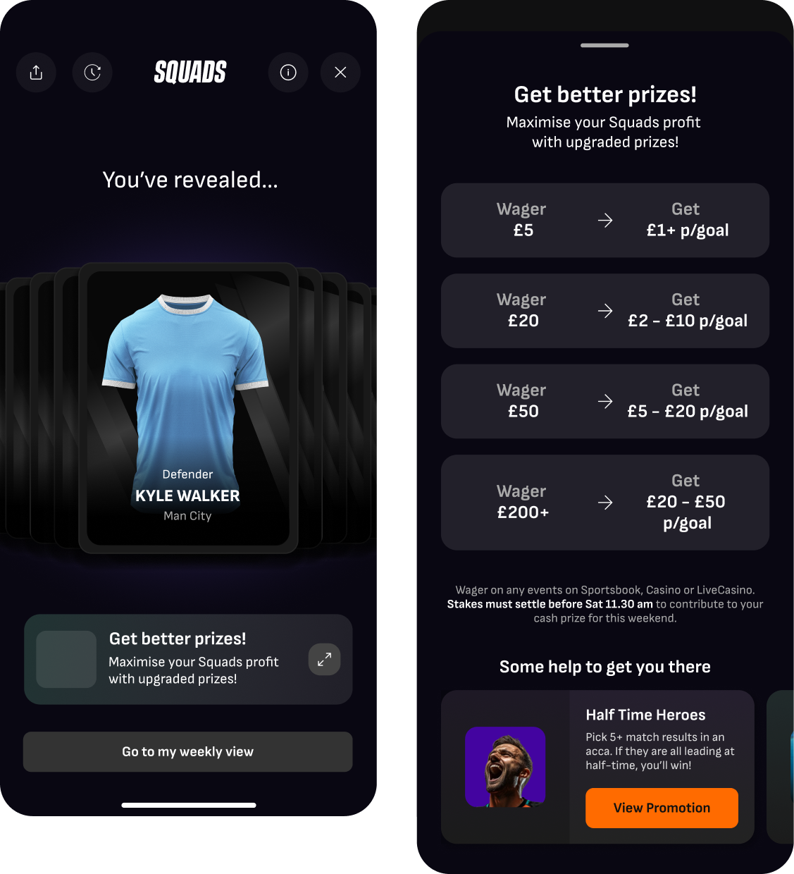 Repurpose promo banners and make them relevant to users’ player reveals, using logic to display the right promotion or betting market based on users’ betting behaviour and the Squads player revealed that day.